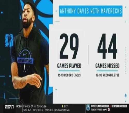 浓眉虽然很玻璃,但他的出场效果很不错。加盟小牛至今,浓眉打了29场比赛,缺席44场,出勤率仅为40.3%,不过他出战时让小牛16胜13负,缺席时则是12胜32负。